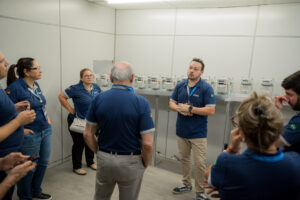 No período do almoço, a delegação seguiu para a fábrica da Aépio, onde os participantes tiveram um momento especial de integração e, posteriormente, uma visita guiada pelas instalações. Durante o percurso, acompanharam de perto as melhorias estruturais, os novos processos de automação e o funcionamento dos laboratórios acreditados pelo Inmetro, reforçando o compromisso da empresa com qualidade e excelência metrológica.