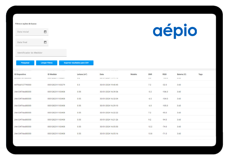 Disponibilizamos o Portal da Aépio, onde constam informações como o volume totalizado, tensão da bateria e qualidade do sinal de transmissão entre o dispositivo e o gateway, com a facilidade de exportar dados em arquivo CSV.
